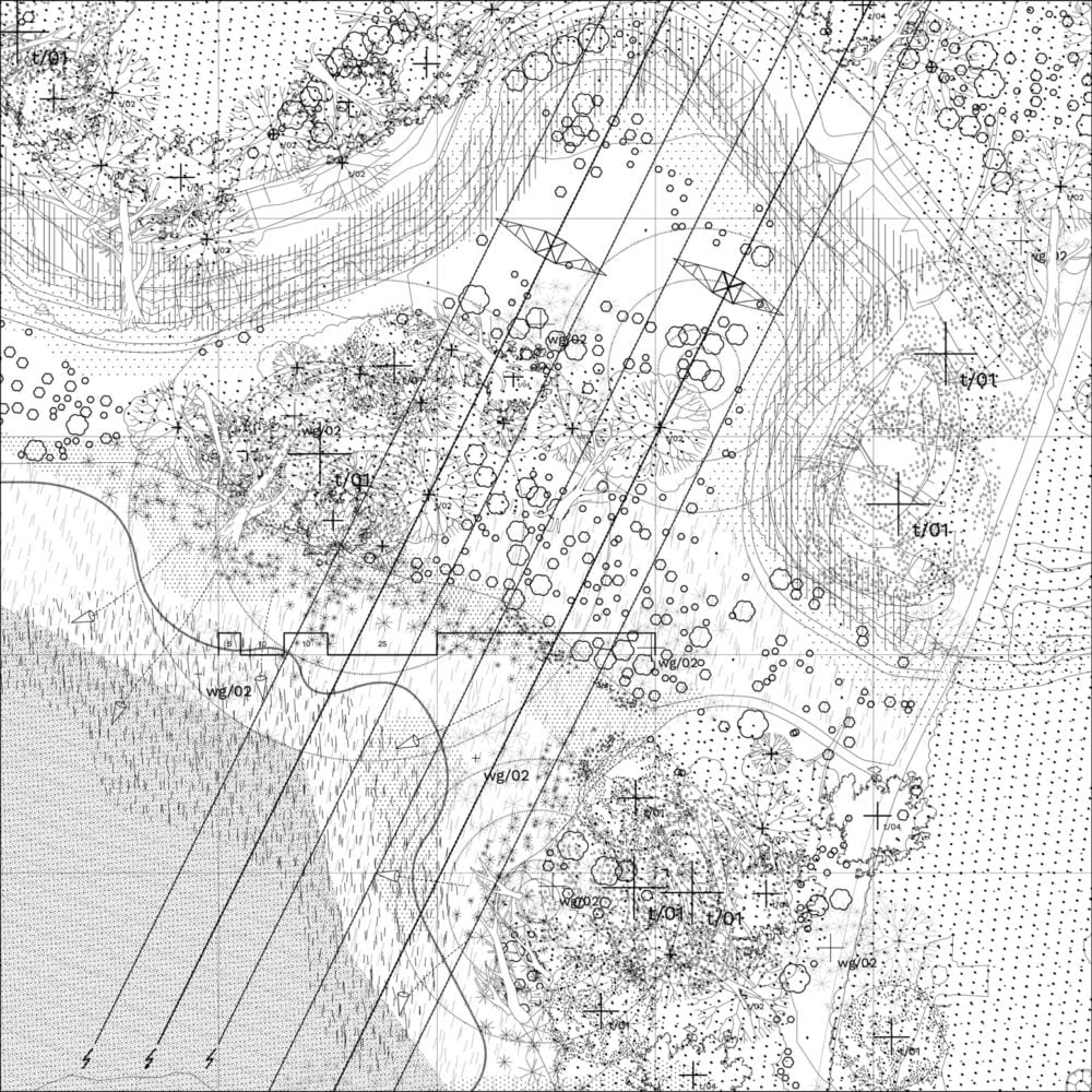 The circle refers to the oil tank (Lobau), which derives its characteristic cylindrical shape from the structural need to contain a liquid material. The cylinder as a basic geometry, as a circle extruded in the third dimension, also marks a psychic container that protects stored ideas and information from the environment. As a Funktionskreis des Lebendigen the circle defines an experimental area, a stage for natural processes to play. Its lack of program is also its intention: To let happen what creates itself if nothing is done (Wildwuchs on a fallow).